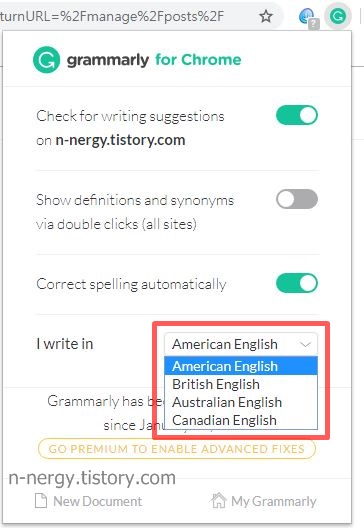 검색창 오른쪽에 있는 Grammarly 아이콘을 클릭하시면, 원하는 영어 종류를 선택하실 수 있어요. 쓰는 나라마다 스펠링이나 표현법이 약간씩 다르기 때문에 미국, 영국, 호주, 캐나다 영어 등 원하시는 영어 스타일을 선택하셔서 교정하실 수 있습니다. 무료 버전에서 이 정도로 세심한 분류가 가능하다니 놀라웠습니다.