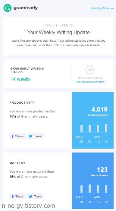 Grammarly를 사용할 때마다 데이터가 쌓여 제 라이팅에 얼마나 많은 오류가 있었는지 분석해 줍니다!