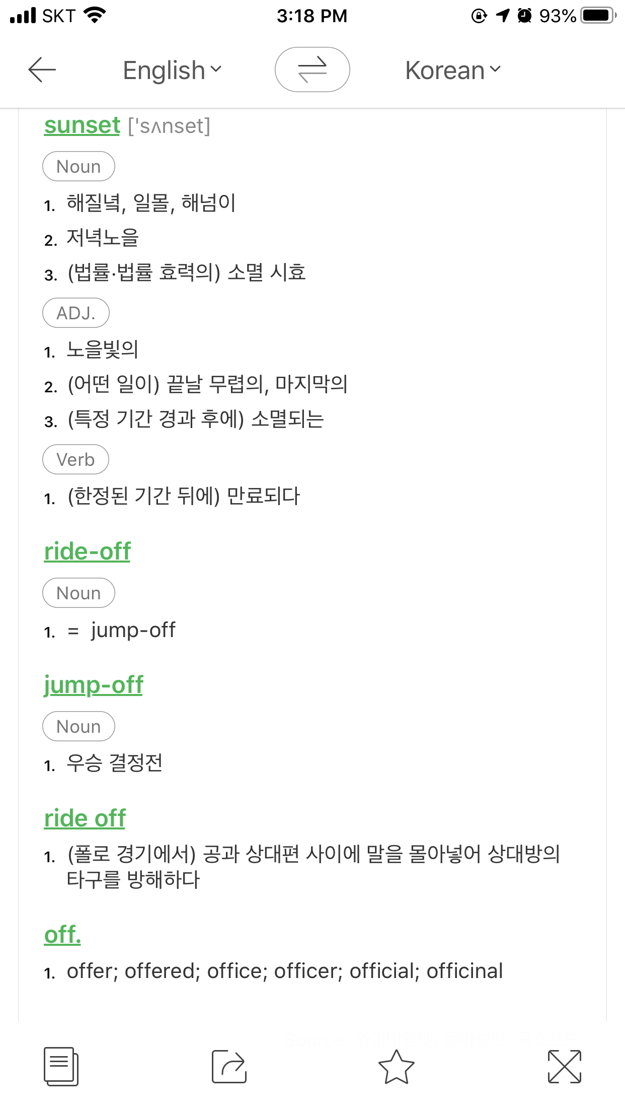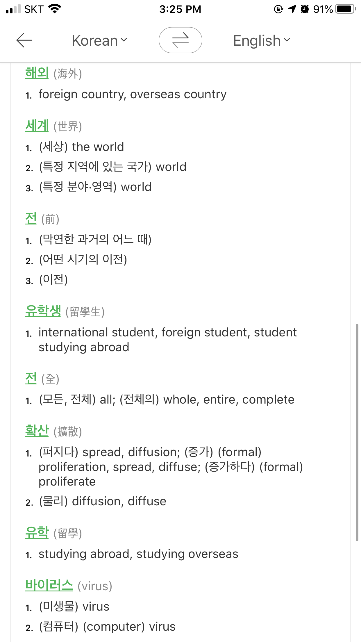 파파고 번역기 - 화면을 아래로 내려 해당 단어를 누르면 사전으로 연결됩니다. 반면 파파고는 해석 아래에 주요 단어들이 표시됩니다. 한영, 영한 번역 모두 사전을 이용할 수 있어요.