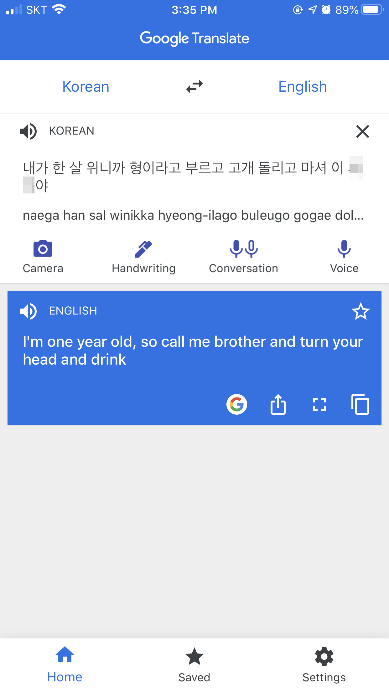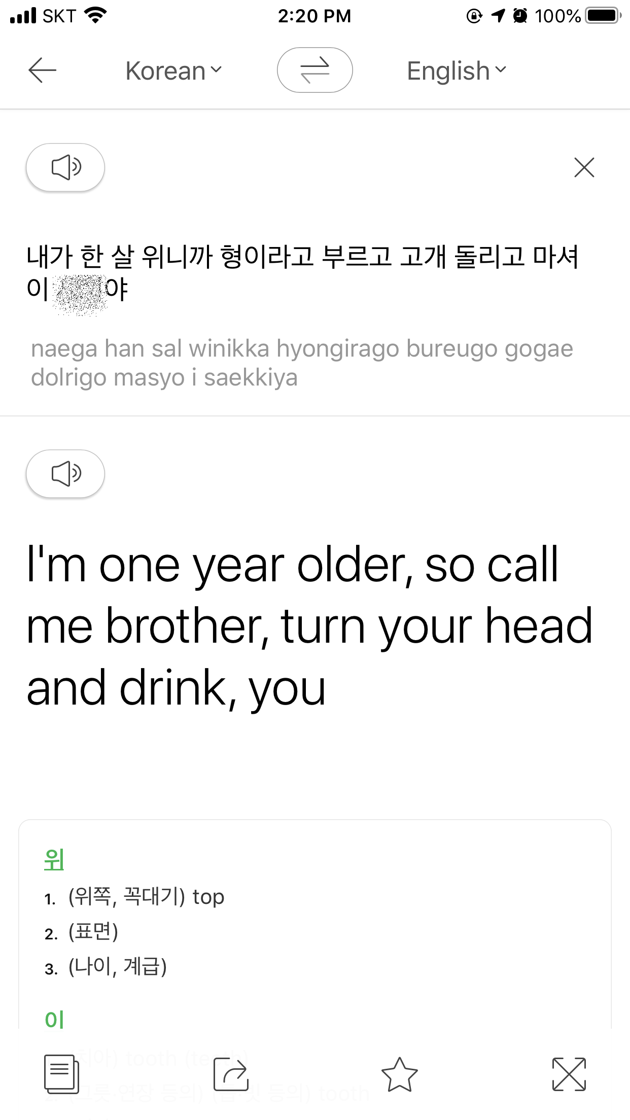 보시면 ‘한 살 위’, ‘형’ 등을 번역해 내지 못하는 것을 볼 수 있습니다.