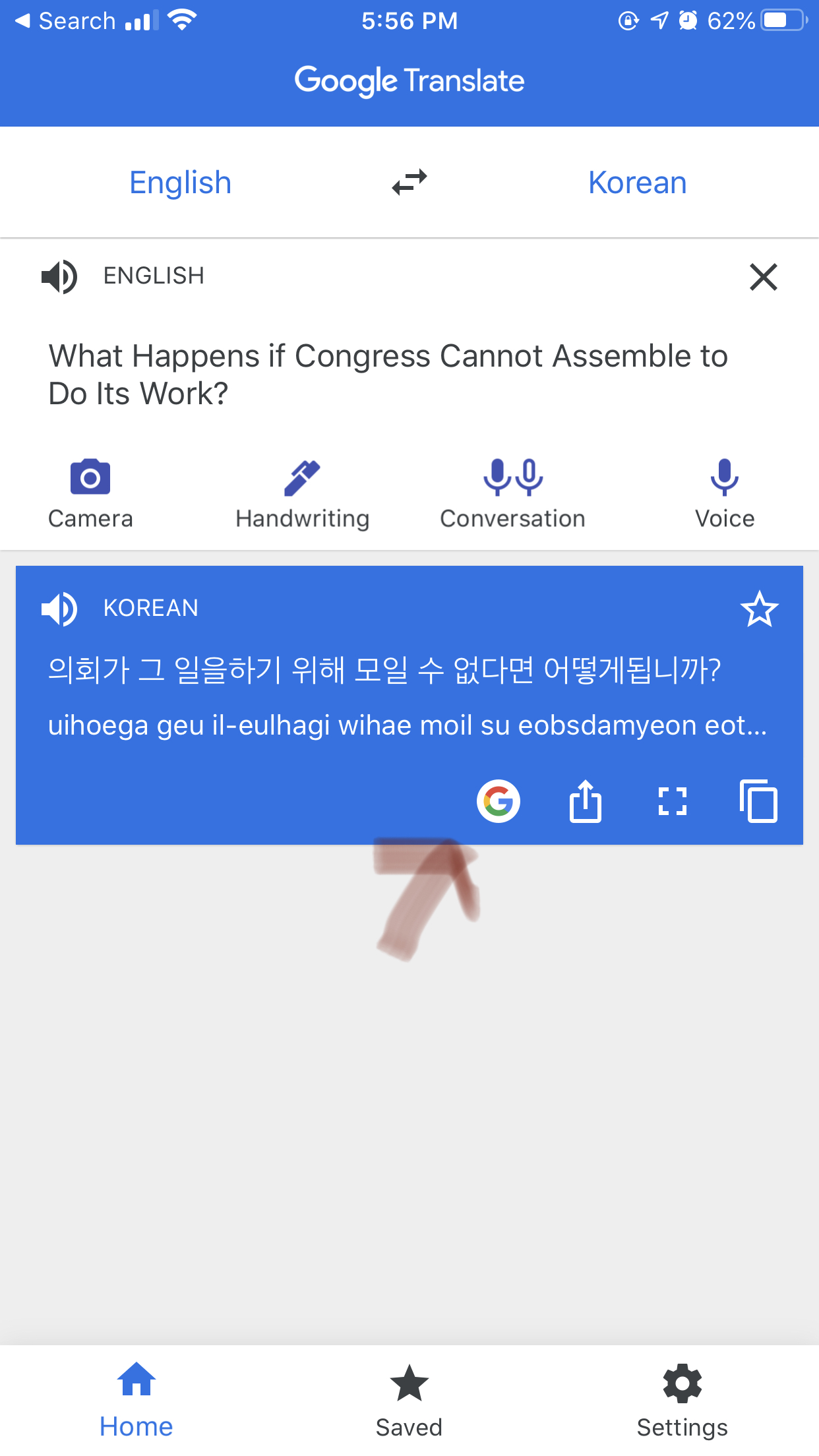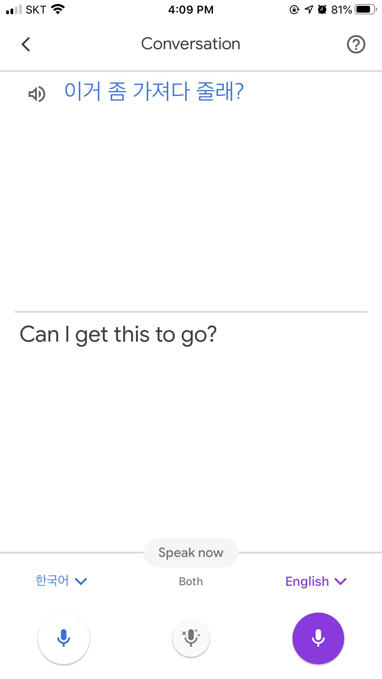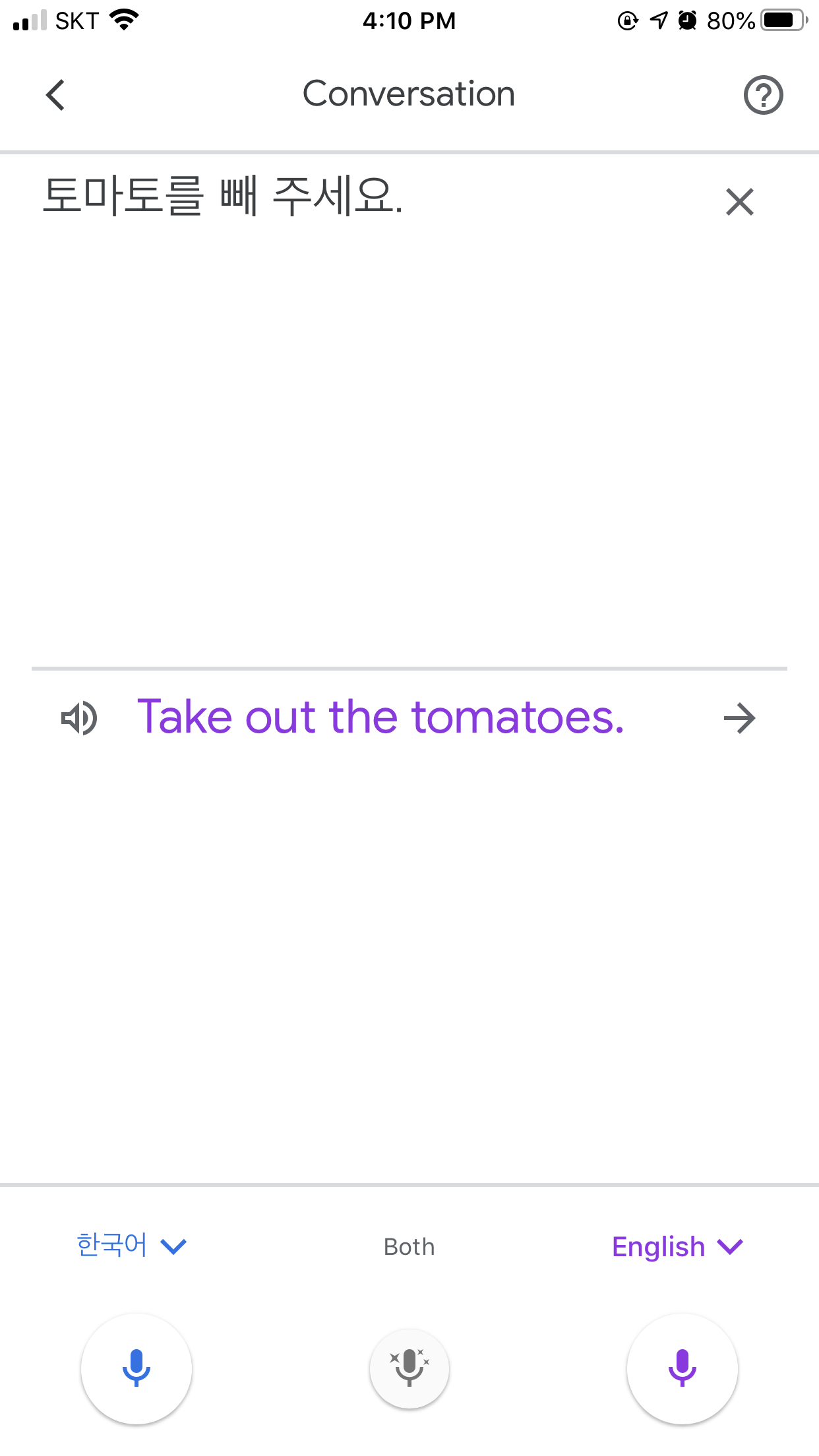 대화모드 - 영한 번역 Conversation 모드입니다. 실시간 대화할 때 유용한 기능인데요, 마이크 버튼을 누르고 말을 하면 바로 번역해서 읽어 줍니다.