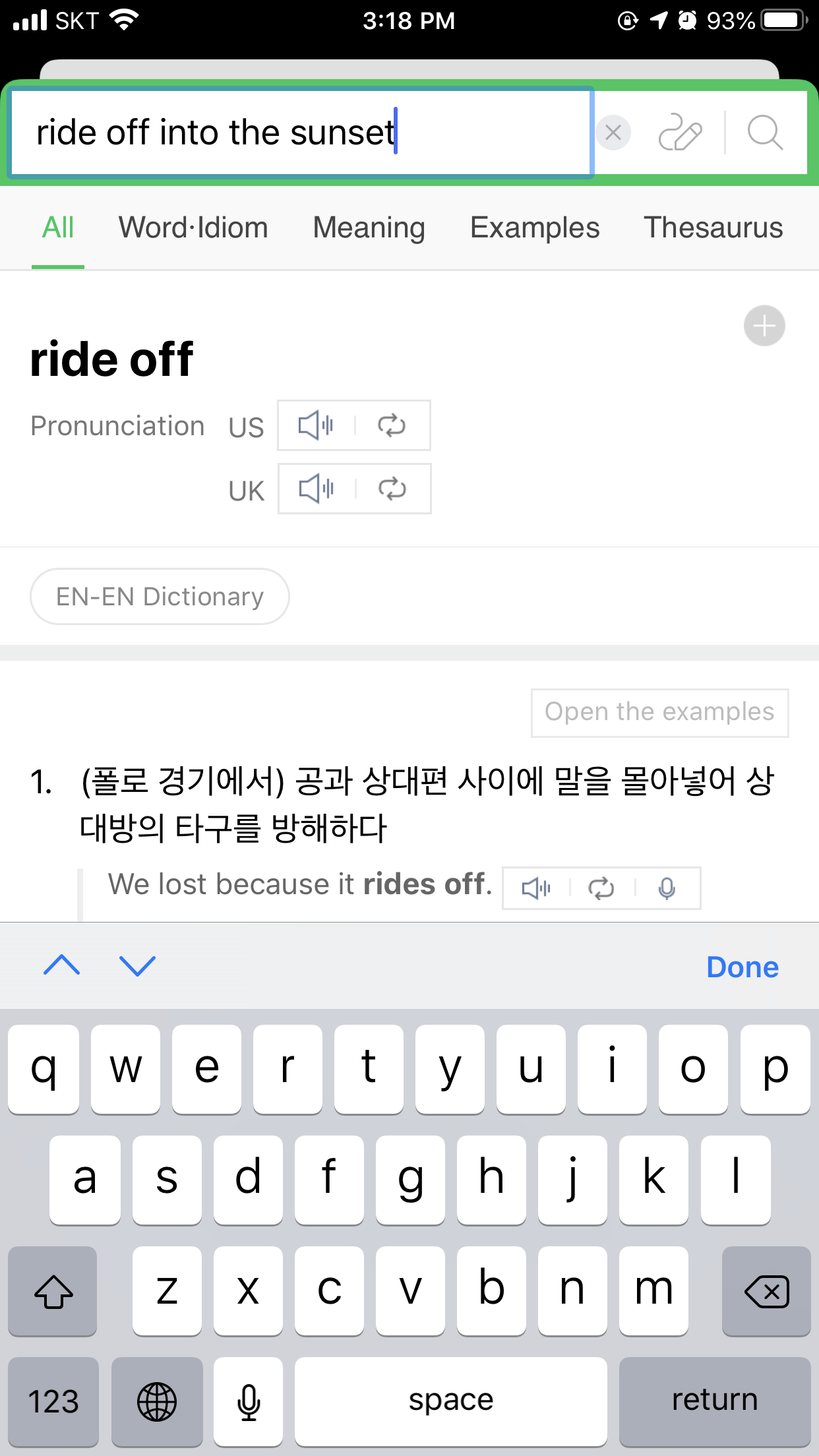 원하는 표현과 가장 가까운 ‘ride off’를 누르고 사전으로 가서 into the sunset을 붙여 검색해 보니 해석이 나옵니다!