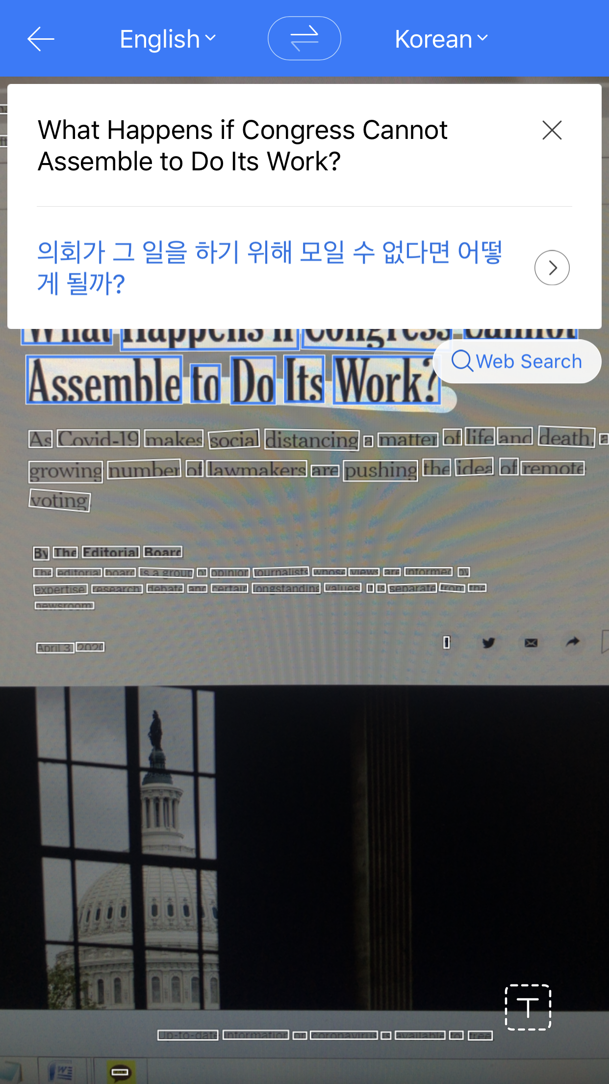 이미지 번역 기능 컴퓨터에 영문 기사를 띄워 놓고 이미지 번역을 해 보았습니다. 먼저 사진을 찍고, 원하는 부분을 손으로 그어 하이라이트를 하면 번역이 됩니다.