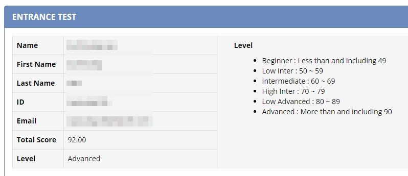 공인 영어 성적이 없으면 자체 레벨 테스트를 통과하시면 됩니다. 테스트를 마치면 이렇게 점수를 확인하실 수 있습니다. 통과하셨다면 이제 등록 신청을 하시면 돼요.