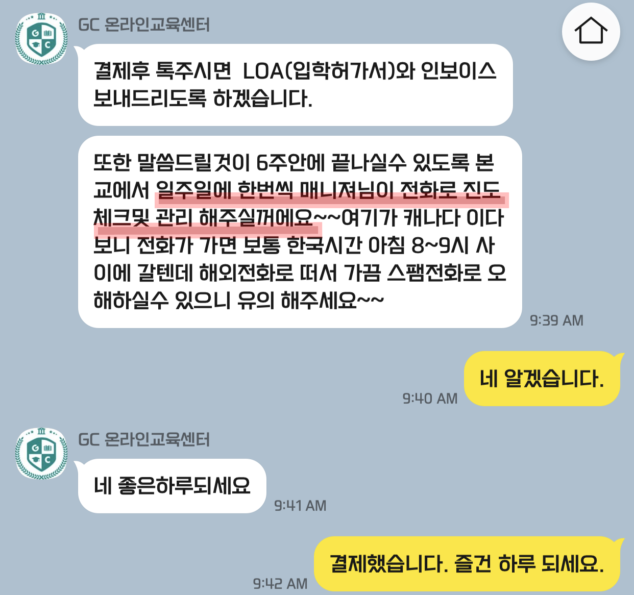 1주일에 한번씩 전화로 학습 관리 1주~2주에 한번씩 전화로 학습 체크를 해 주시는데, 처음에 전화를 받고는 너무 놀랐습니다.