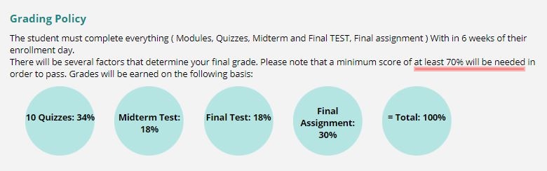 각 모듈마다 퀴즈가 있는데 총 10개의 퀴즈가 있습니다. 그리고 5모듈을 끝나면 중간 고사1, 그리고 또 5모듈 후에 중간고사 2가 있습니다. 학습을 마친 뒤 파이널 테스트가 있고, 마지막으로 파이널 과제를 제출하여 총 70점 이상을 맞으면 합격입니다.^^