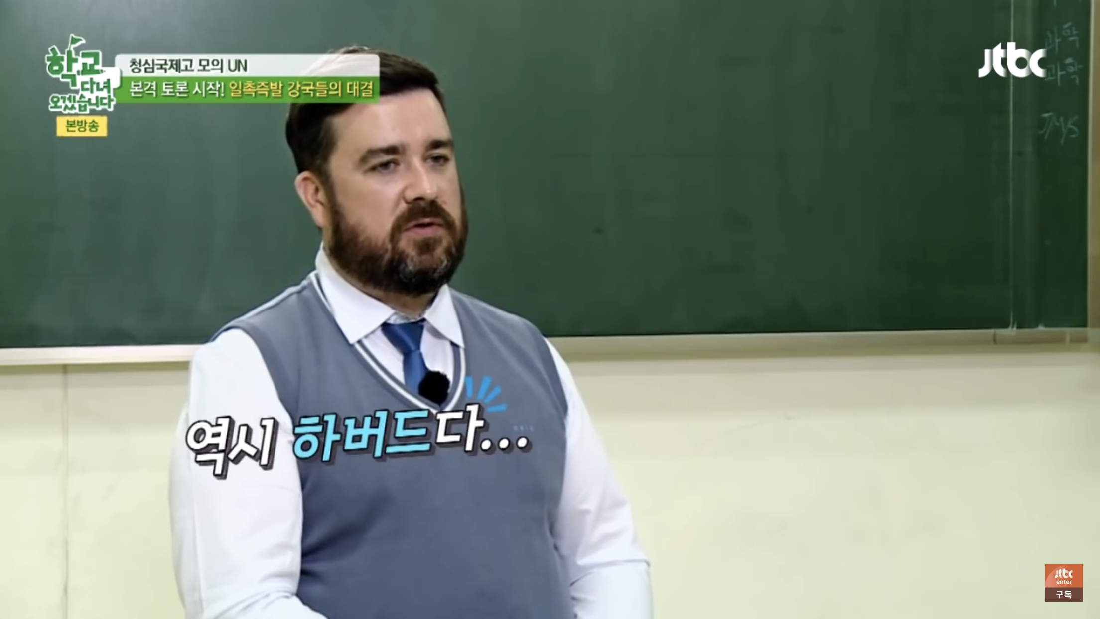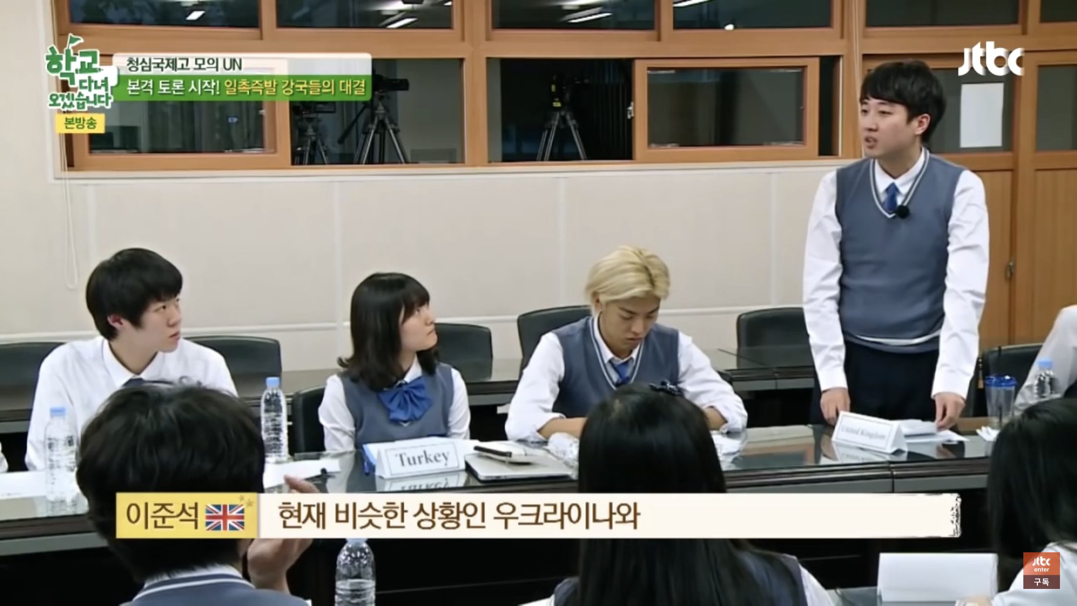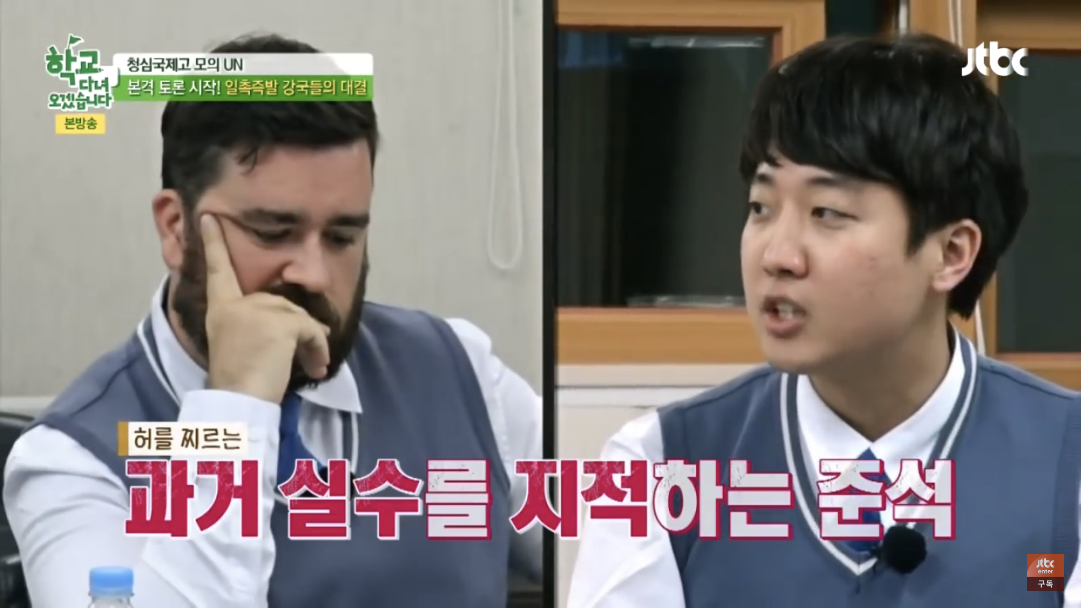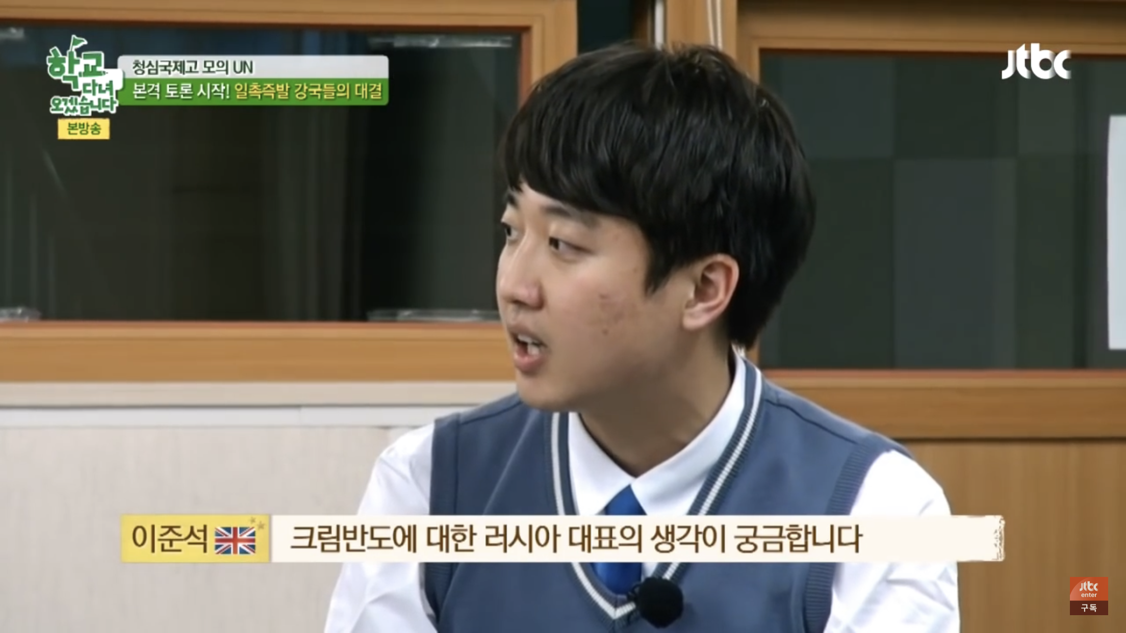 이준석은 지난 2015년 JTBC 예능 <학교 다녀오겠습니다>에서도 수준급의 영어 토론을 보여준 바 있습니다. 출연자들이 '시리아 난민 사태'에 대해 각국의 대표가 되어 하는 모의 UN이었는데요. 러시아 대표로 분하여 미국 대표를 비난하는 샘 해밍턴의 발언에, 영국 대표로서 러시아 측의 발언이 과거 행적과 불일치한다고 지적했습니다.