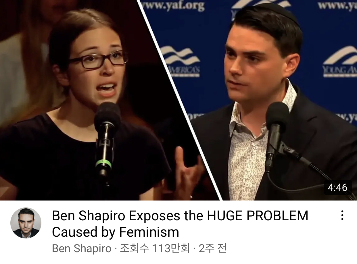 말이 무지하게 빠른 벤 샤피로의 유튜브 채널에는, 페미니스트들의 질문에 사이다 답변하는 형식의 영상이 많이 올라옵니다.