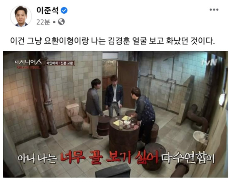 이준석은 가장 짜증나게 하는 게 김경훈 같은 '미친놈 유형'이라고 했습니다.^^;;; 이순신 같은 장군들이 싸우고 있는데 갑자기 돈키호테 하나 끼어든 느낌이라면서요. 어디로 튈지 모르는 김경훈의 캐릭터를 정말 딱 맞게 표현한 것 같아요.